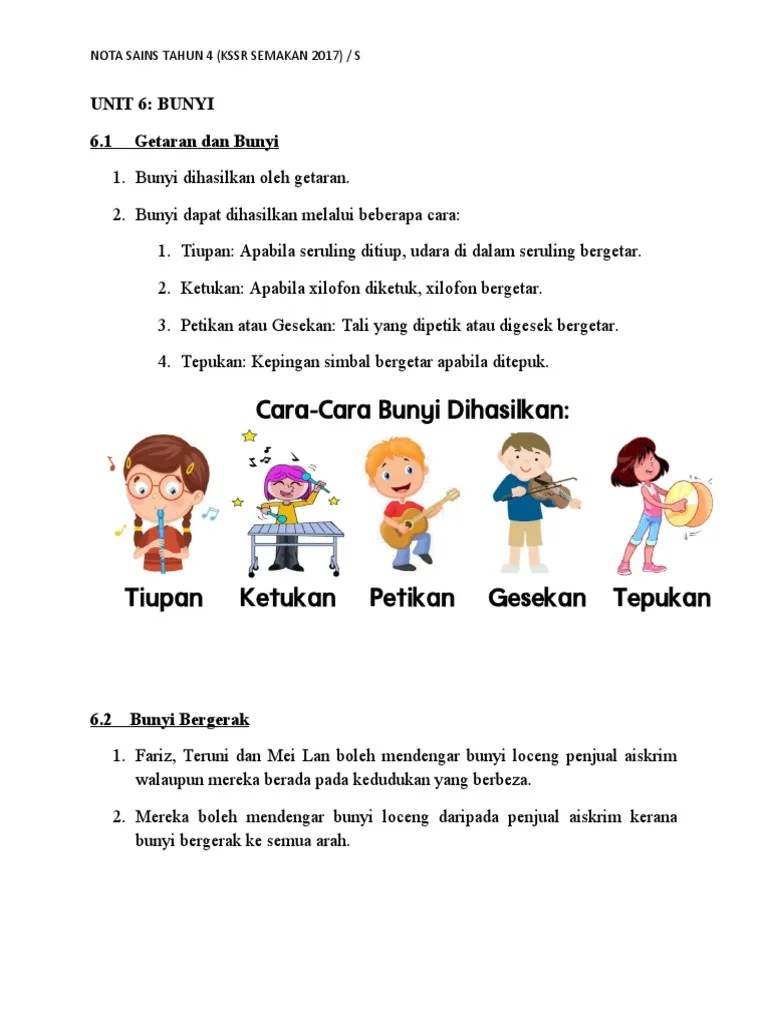 Nota Sains Tajuk Bunyi Tahun 4 - Nota Sains Tahun 4 Unit 6 Bunyi Chang Tun Kuet. Nota sains] bunyi (kssr semakan) tahun 4. Sains tahun 4 unit 6: Jom buat revision ringkas topik bunyi tahun 4 kssr semakan yang merangkumi getaran dan bunyi, bunyi bergerak, bunyi dipantulkan, . Bunyi dapat dihasilkan melalui beberapa cara: Kepingan simbal bergetar apabila ditepuk. Bunyi, merangkumi subtopik getaran, cara bunyi dihasilkan, . Nota sains tahun 4 topik bunyi kssr semakan sains tahun 4 bunyi disediakan.